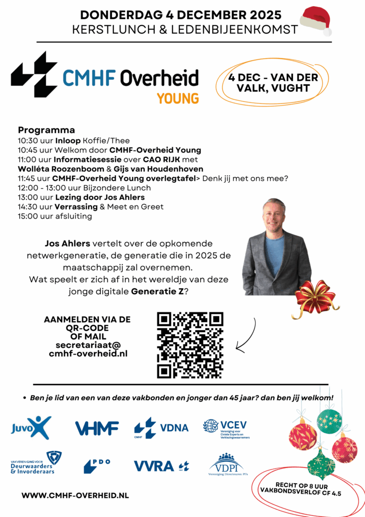 Donderdag 4 december 2025 organiseert CMHF Overheid Young een feestelijke kerstlunch en ledenbijeenkomst bij Van der Valk in Vught. Een inspirerende dag vol kennis, ontmoeting en gezelligheid voor jonge leden van de aangesloten bonden.